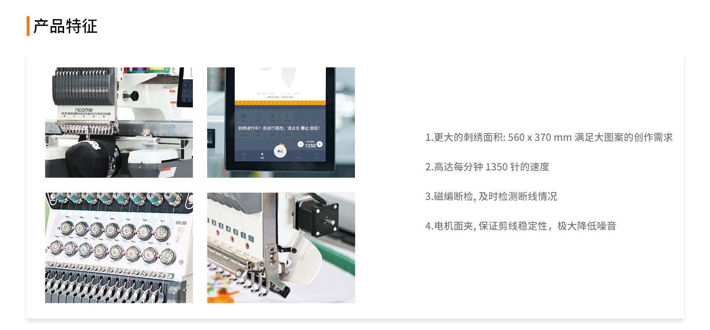 | 機(jī)器型號(hào) | 頭數(shù) | 針數(shù) | 凈重 | 刺繡面積 | 機(jī)器尺寸 |